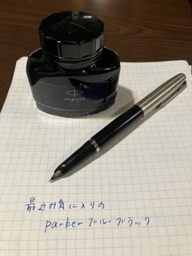 最近ハマっているのは万年筆…パーカーのくみ上げ式の万年筆で、インク色はブルーブラック✒️